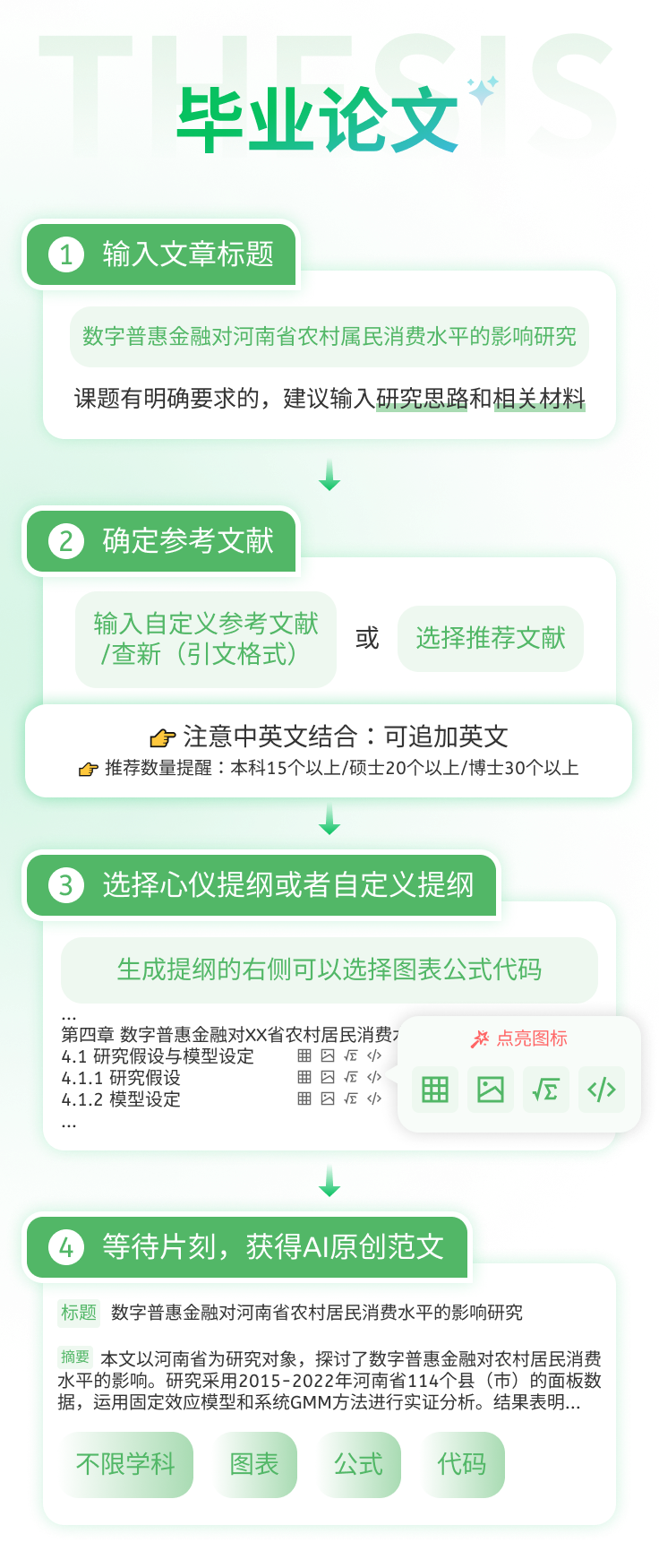 网络数据、图、表、公式、代码(仅供参考,小节右侧勾选)提纲处自定义插入,数据、图表、公式、代码结合上下文生成,内容不空洞